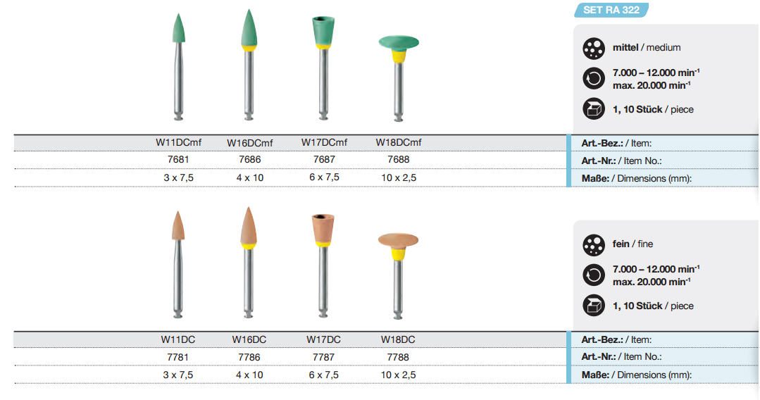 Zestaw gumek polerskich EVE Diacera SET RA 322 to narzędzia stomatologiczne do polerowania i wykańczania różnych materiałów stomatologicznych. Oznaczenie "RA 322" odnosi się do rodzaju łącza RA (Right Angle), które pasuje do turbiny stomatologicznej.