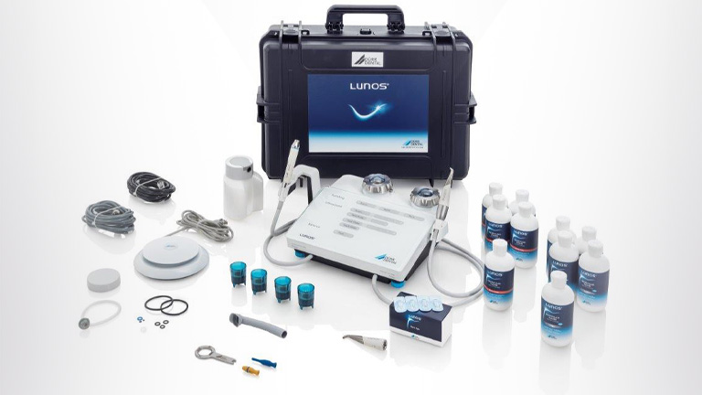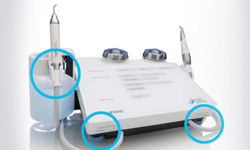 MyLunos Duo® ma stałe przyłącze wody do zastosowań Polishing i Ultrasound, a także dołączany zbiornik na wodę o pojemności 500 ml do zastosowań ultradźwiękowych. W przypadku zastosowań ultradźwiękowych w zależności od potrzeb można wybrać odpowiedni dopływ wody. Woda jest podgrzewana do temperatury komfortowej dla pacjenta.