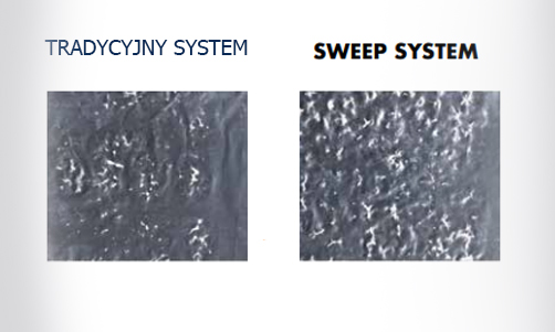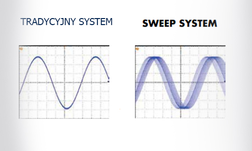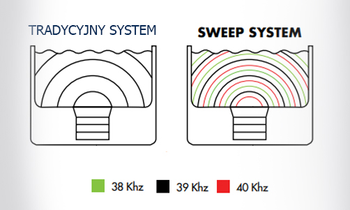 Dzięki technologii Sweep System częstotliwość wyjściowa generatora ultradźwiękowego jest modulowana wokół częstotliwości środkowej, więc przetworniki ultradźwiękowe zmieniają się między 39 a 41 kHz. Poniższy schemat pokazuje różnicę między myjką ultradźwiękową z konwencjonalnym generatorem energii ultradźwiękowej (system tradycyjny), a nowym generatorem ultradźwiękowym wyposażonym w specjalny oscylator ultradźwiękowy z technologią Sweep System. Oba systemy są porównywane i pokazują różny rozkład fal ultradźwiękowych do cieczy czyszczącej, ich widok oscyloskopu przebiegowego i wreszcie praktyczne wyniki uzyskane na próbce aluminium.
