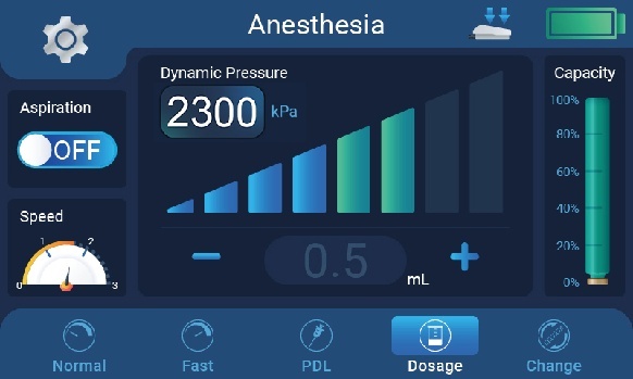 4 tryby wstrzykiwania – PDL, Normal, Fast, Dosage – z możliwością zmiany podczas zabiegu.
